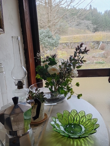 花とアンティークの特等席(店主が大切に育てたクリスマスローズを額縁のような窓から眺めて)